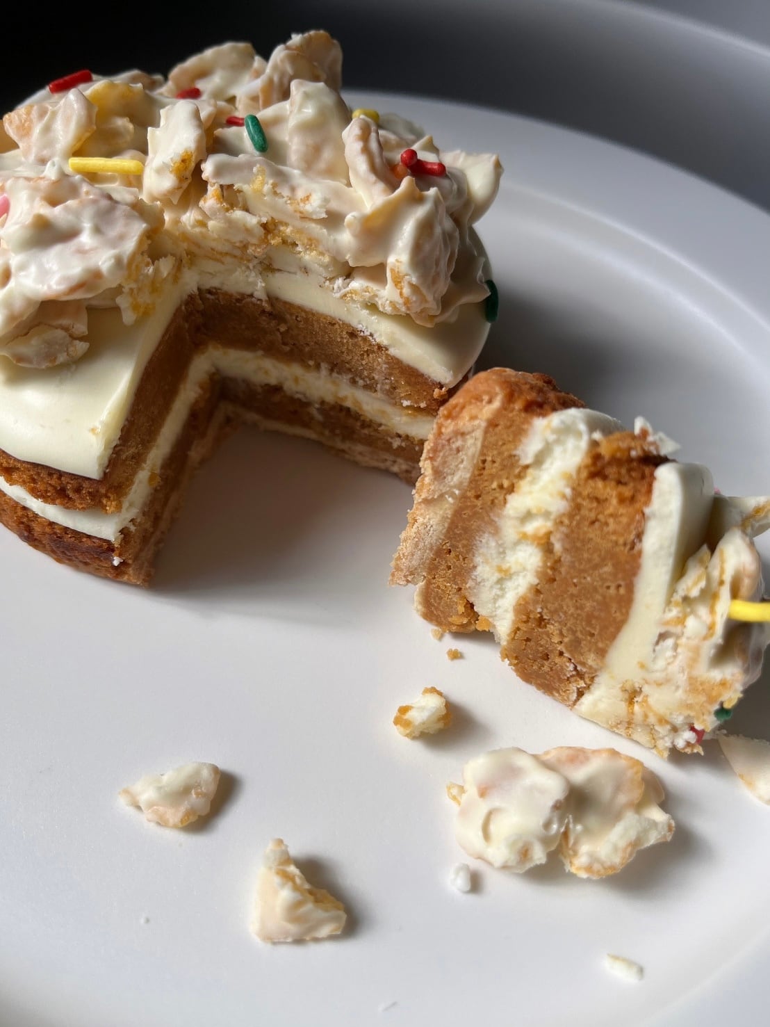 トップにはホワイトチョコを纏ったコーンフレークとカラフルなシュガースプレーをあしらいました。